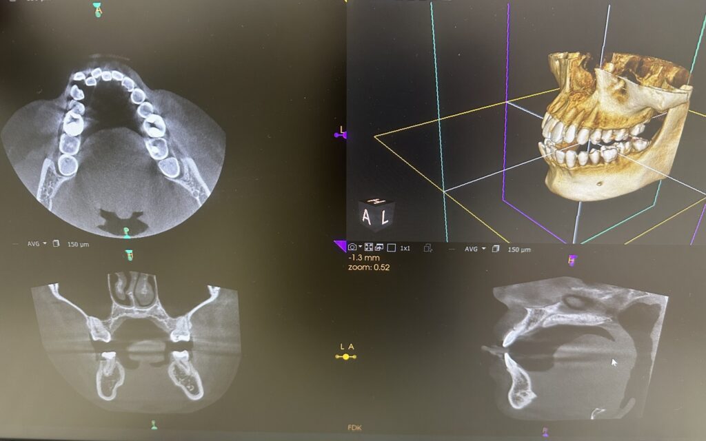 CTを用いることで、3次元的に歯の根っこの位置と骨の厚みを確認します。